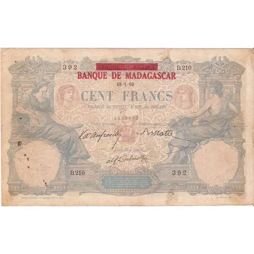 Obverse lettering Banque de Madagascar cent francs DANIEL DUPUIS ET GEORGES DUVAL FEC. A LEVEILLE . CS.