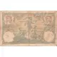 Obverse description Two seated women symbolizing Industry and Agriculture frame two heads printed in roses in medallions, on either side of the lettered value. In the background, Mercury engraves a stele. Article 139 of the penal code is printed in pink on a blue background at the bottom. The `BANQUE DE FRANCE` mansion is covered by a red band, and the `BANQUE DE MADAGASCAR` mansion is added below the former mansion.