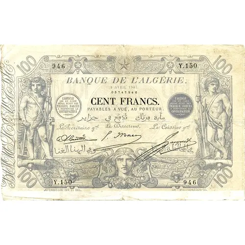 Banque de l`Algérie Cent Francs Payable a vue, au porteur GA-CABASSON, INV ET DEL. CH - WULLSCHLEGER SC. (Translation: Bank of Algeria One Hundred Francs Payable on sight, to the bearer) |