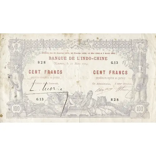 DÉCRETS DES 21 JANVIER 1875, 20 FÉVRIER 1888 & 3 AVRIL 1901 BANQUE DE L'INDO-CHINE NOUMÉA CENT FRANCS CENT FRANCS PAYABLES EN ESPÈCES AU PORTEUR PAYABLES EN ESPÈCES AU PORTEUR LE CAISSIERE DE LA SUCURSALE UN ADMINISTRATEUR L'ADMR-DIRECTEUR A BRAMTOT ET G. DUVAL. FEC CH. WULLSCHLEGER SC |