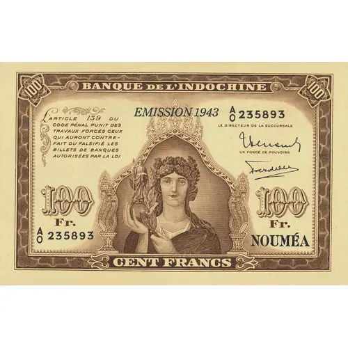 | Obverse lettering | BANQUE DE L`INDOCHINE EMISSION 1943 L`article 139 du Code Pénal punit des travaux forcés ceux qui auront contrefait ou falsifié les billets de banques autorisées par la loi. NOUMÉA 100 Fr. CENT FRANCS (Translation: Bank of Indochina 1943 Issue Article 139 of the Penal Code punished by forced labor perpetuity of those who have counterfeit or falsified these vouchers as well as those who have made use of these vouchers counterfeit or falsified. Noumea 100 Fr. Hundred Francs) |