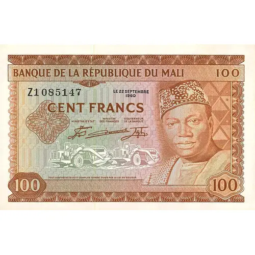 | Descripción del anverso | Brown on multicolor underprint. Construction machines, at center left; portrait of President Modibo Keita at right. |