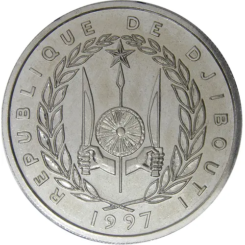 | Obverse description | A laurel wreath around Djibouti coat of arms: Two fists holding a knife, a round shield over a spear and a star on the top. |