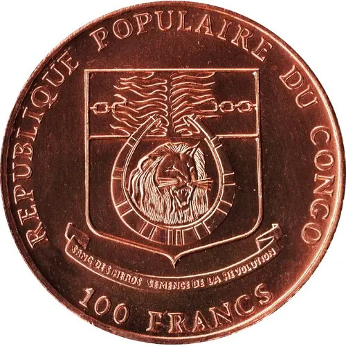 | Legenda awersu | REPUBLIQUE POPULAIRE DU CONGO SANG DES HEROS SEMENGE DE LA REVOLUTION 100 FRANCS (Translation: People`s Republic of Congo) |