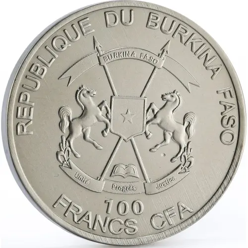 REPUBLIQUE DU BURKINA FASO BURKINA FASO UNITE PROGRES JUSTICE 100 FRANCS CFA (Translation: Republic of Burkina Faso Unity, Progress, Justice) |