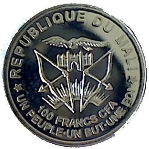 | Obverse lettering | ★ REPUBLIQUE DU MALI ★ 100 FRANCS CFA UN PEUPLE•UN BUT•UNE FOI (Translation: Republic of Mali, One People, One Goal, One Faith) |