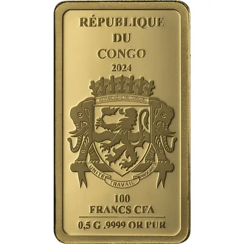 REPUBLIQUE DU CONGO 2024 REPUBLIQUE DU CONGO UNITE TRAVAIL PROGRES 100 FRANCS CFA 0,5 G .9999 OR PUR (Translation: Republic of the Congo Republic of the Congo Unity Work Progress 0.5 G .9999 Pure Gold) |