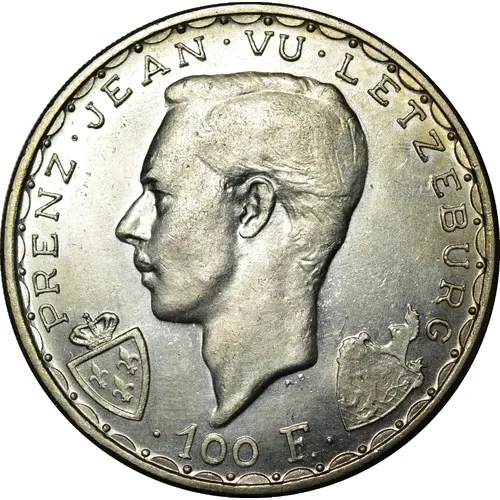 | Описание аверса | Portrait on the left of Prince Jean (1921-), Grand Duke heir of Luxembourg. On the left the crowned escutcheon of the Bourbons, on the right the escutcheon of Luxembourg surmounted by a crested helmet. Initials of the engraver under the cut of the neck. Around the legend in Luxembourg and the face value between two points to the exergue. |