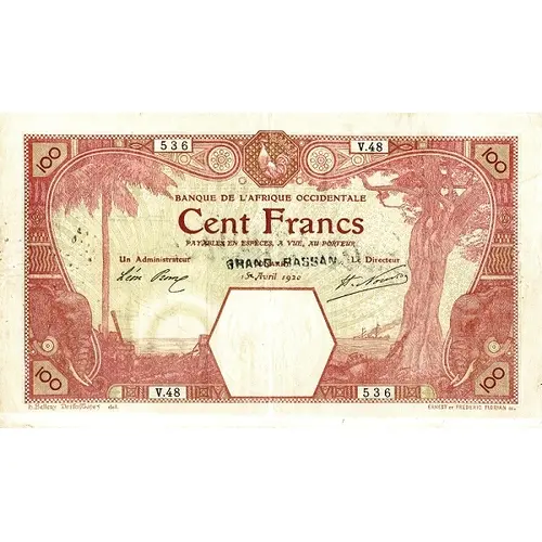 | Obverse lettering | BANQUE DE L`AFRIQUE OCCIDENTALE CENT FRANCS PAYABLES EN ESPÈCES, A VUE, AU PORTEUR GRAND-BASSAM h.Bellery Desfontaines del. ERNEST ET FREDERIC FLORIAN SC. |