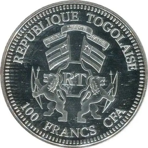 | Ön yüz lejandı | REPUBLIQUE TOGOLAISE RT 100 FRANCS CFA (Translation: Togolese Republic Labour Freedom Homeland) |