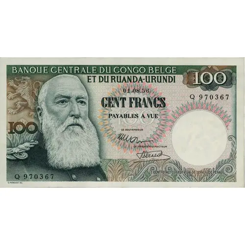 Obverse lettering Banque Centrale du Congo Belge et du Ruanda-Urundi Cent Francs payable à vue G. MINGUET SC