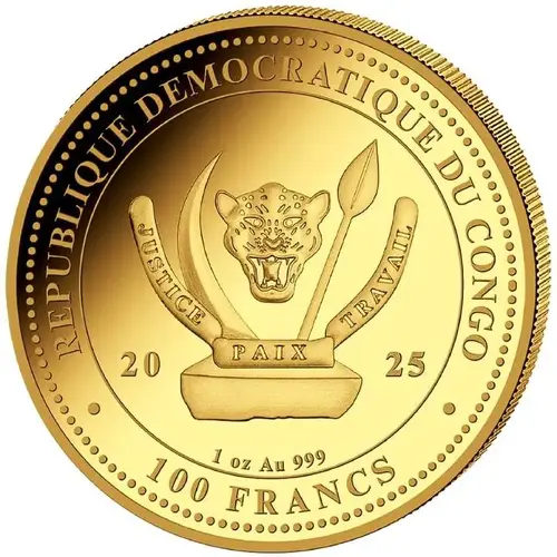 | Averslegende | REPUBLIQUE DEMOCRATIQUE DU CONGO JUSTICE PAIX TRAVAIL 2025 1 oz Au 999.9 100 FRANCS (Translation: Democratic Republic of the Congo Justice Peace Work) |