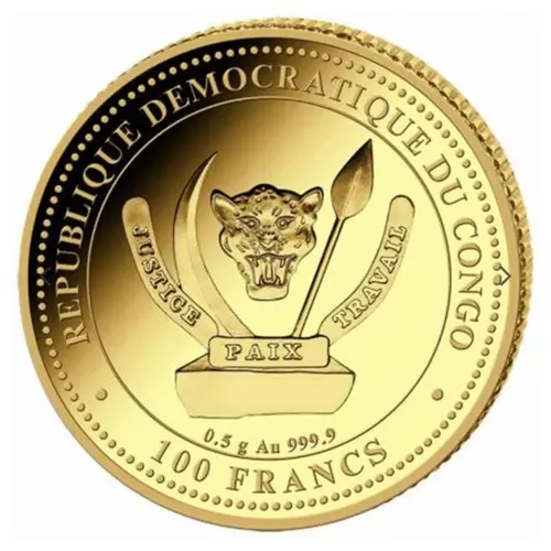 | Obverse lettering | REPUBLIQUE DEMOCRATIQUE DU CONGO JUSTICE PAIX TRAVAIL 0.5 g Au 999.9 100 FRANCS (Translation: Democratic Republic of the Congo Justice Peace Work) |