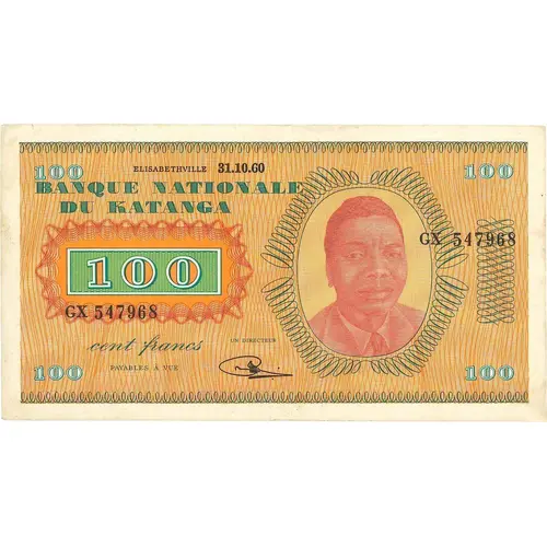 | 表面の銘文 | BANQUE NATIONALE DU KATANGA CENT FRANCS PAYABLES A VUE |