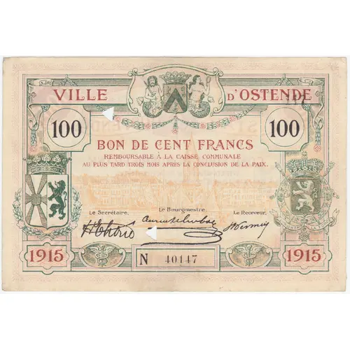 VILLE D`OSTENDE 100 100 BON DE CENT FRANCS REMBOURSABLE À LA CAISSE COMMUNALE AU PLUS TARD TROIS MOIS APRÈS LA CONCLUSION DE LA PAIX. Le Bourgmestre, Le Secrétaire, Le Receveur, (3 signatures) 1915 N 40147 1915 |