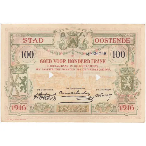 STAD OSTENDE 100 K 026799100 GOED VOOR HONDERD FRANK UITBETAALBAAR IN DE GEMEENTEKAS TEN LAATSTE DRIE MAANDEN NA DE VREDESLUITING. de Burgemeester, De Secretaris, De Ontvanger, (3 signatures) 1916 1916 |