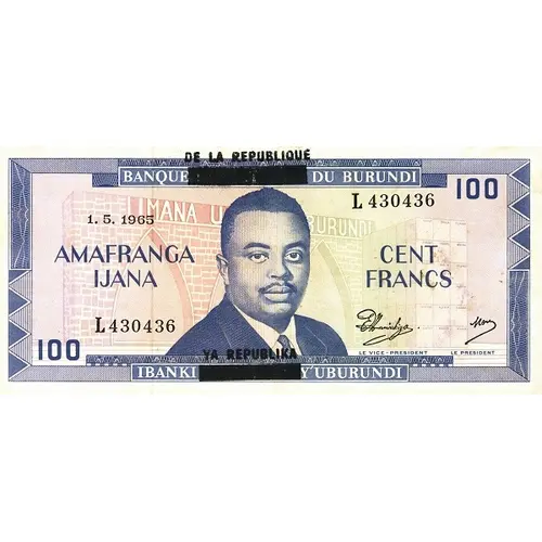 BANQUE DE LA REPUBLIQUE DU BURUNDI CENT FRANCS AMAFRANGA IJANA IBANKI YA REPUBLIKA Y`UBURUNDI LE VICE-PRESIDENT LE PRESIDENT 1.5.1965 100 (Translation: Bank of the Republic of Burundi. One hundred francs. The vice president, the president.) |