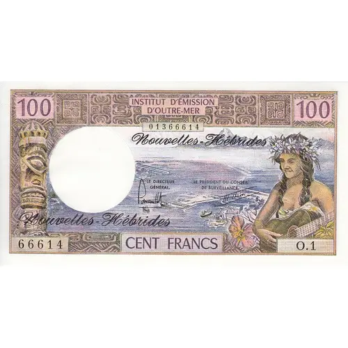 Institut D`Emission D`Outre-Mer Nouvelles Hėbrides Nouvelles Hėbrides CENT FRANCS (Translation: Overseas Broadcast Institute New Hebrides One Hundred Francs) |