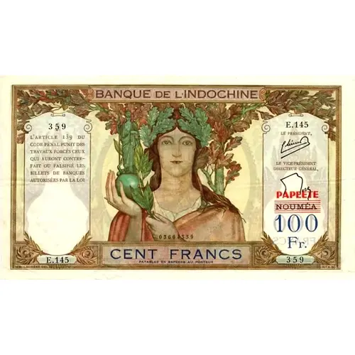 | Obverse description | Multicolor. Woman with wreath and small figure of Athena at center. Overprinted in red `PAPEETE` over crossed NOUMÉA. |