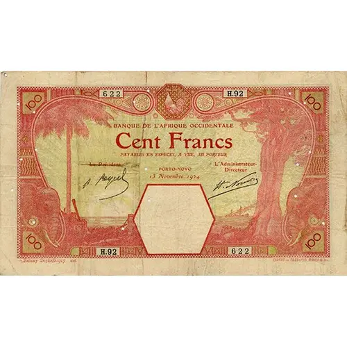 | Opschrift voorzijde | BANQUE DE L`AFRIQUE OCCIDENTALE CENT FRANCS PAYABLES EN ESPÈCES, A VUE, AU PORTEUR PORTO-NOVO h.Bellery Desfontaines del. ERNEST ET FREDERIC FLORIAN SC. |