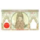Descrizione del dritto Brown and green print; yellow underprint; black serial numbers. Front-facing woman wearing laurel (Laurus nobilis) wreath, holding small figure of Athena in right hand at centre. Tree in background. Value at lower right on red background.