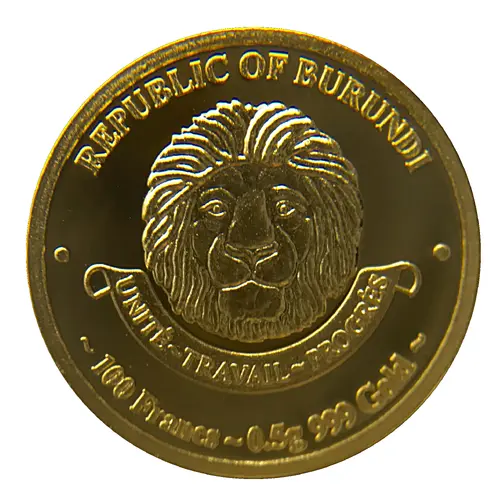 | Obverse lettering | REPUBLIC OF BURUNDI UNITÉ - TRAVAIL - PROGRÈS 100 Francs 0.5g 999 Gold |