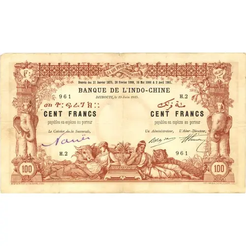 | Legenda del dritto | LA LOI PUNIT LE CONTREFACTEUR Décres de 21 Janvier 1875, 20 Février 1888, 16 Mai 1900 & 3 Avril 1901 BANQUE DE L`INDO-CHINE DJIBOUTI, le 19 Juin 1915 አንድ መቶ ፍራንክ مئة فرنك CENT FRANCS payables en espèces au porteur Le Caissier de la Sucursale, Un Administrateur, L`Adm-Directeur ፻ نك ١٠٠ 100 A BRAMTOT ET G DUVAL FEC CH WULLSCHLEGER SC. (Translation: The law punishes the counterfeiter. Decrees of January 21, 1875, February 20, 1888, May 16, 1900 & April 3, 1901. Bank of Indochina. Djibouti, June 19, 1915. One hundred francs. Payable in cash to bearer. Branch cashier, one administrator, the director administrator. 100.) |