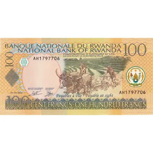 | Obverse lettering | Banque Nationale Du Rwanda National Bank of Rwanda Payable a vue - Payable at sight 100 Cent Francs One Hundred Francs |