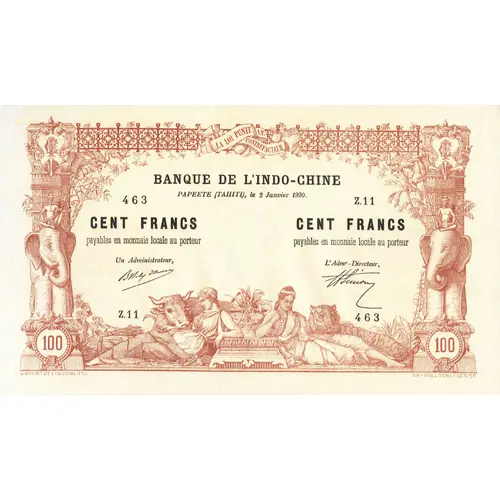 | Obverse lettering | LA LOI PUNIT LE CONTREFACTEUR BANQUE DE L`INDO-CHINE PAPEETE (TAHITI), le 2 Janvier 1920. CENT FRANCS payables en monnaie locale au porteur A.BRAMTOT ET G.DUVAL FEC. CH-WULLSCHLEGER.SC. (Translation: The law punishes the counterfeitor Bank of Indochina Papeete (Tahiti), January 2, 1920. Hundred Francs payable in local currency to bearer) |