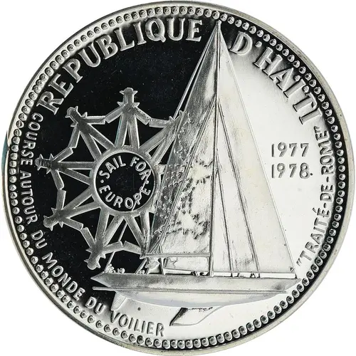| Obverse lettering | REPUBLIQUE D`HAÏTI 1977 1978 SAIL FOR EUROPE COURSE AUTOUR DU MONDE DU VOILIER .TRAITE DE ROME. (Translation: Republic of Haiti Sailing Journey Around the World Treaty of Rome) |