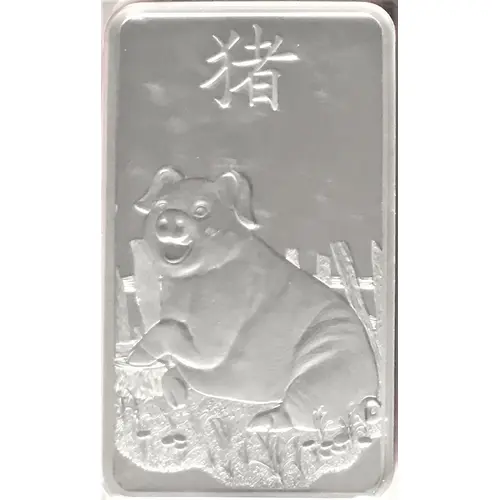 The back of the pig depicted on the obverse, and the design reveals that behind the fence there are two piglets hanging out. One of the piglets is depicted lying down while the other is up on all fours and ready to rumble. |