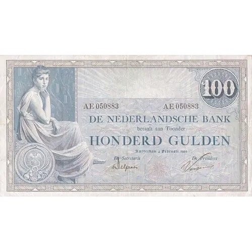 | 正面铭文 | 100 DE NEDERLANDSCHE BANK betaalt aan Toonder HONDERD GULDEN Amsterdam 4 April 1922 (Translation: Bank of Netherlands Pay to the Bearer One Hundred Gulden Amsterdam, April 4, 1922) |