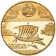 Against the dark background there is depicted a sailing vessel with images of dolphins and decorative meander lines, symbolizing the water, thereunder; to the left and right of the vessel there are depicted fragments of buildings of the city; above, against the light background, there is depicted a gold coin, i.e. Panticapaeum stater with the legend БОСПОРСЬКЕ ЦАРСТВО (Bosporan Kingdom) thereunder. |