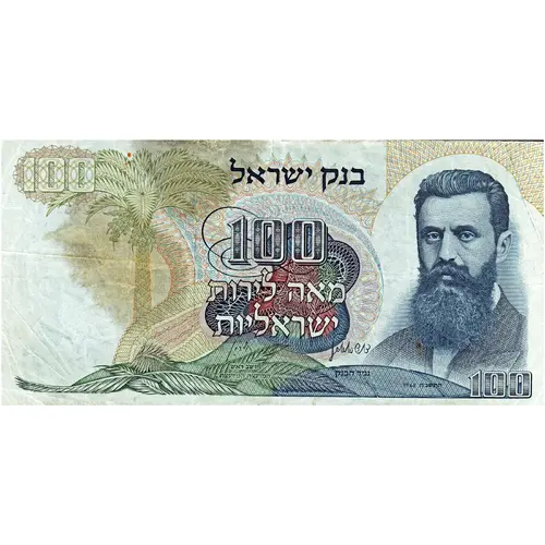 Portrait of Theodor Herzl and a stylized palm tree; the denomination `One Hundred Israeli Pounds` and `Bank of Israel` in Hebrew. |