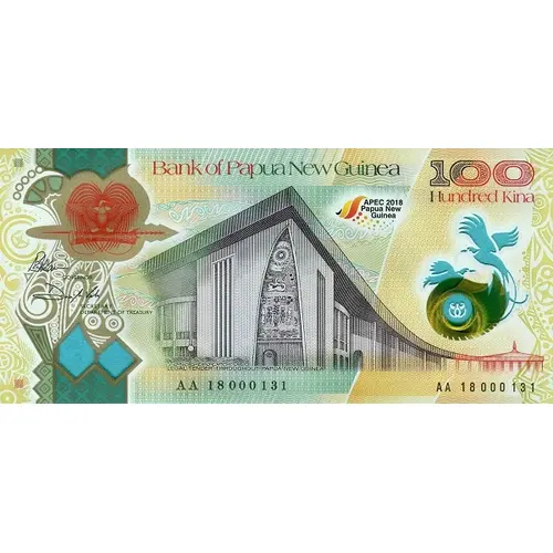 | Obverse description | Parliament building, Port Moresby APEC 2018 Papua New Guinea Logo and the National Crest of Papua New Guinea on the left, which is a stylised Bird of Paradise sitting on a Kundu (drum) and a Spear. Below Complex clear window incorporating a vignette of the Bank of Papua New Guinea logo. On the right security G-Switch™ Feature and see-through two Birds of Paradise one in full flight and the second sitting in the nest. |