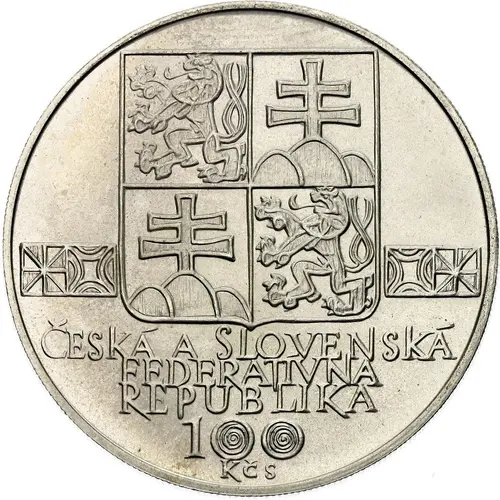 | Ön yüz lejandı | ČESKÁ A SLOVENSKÁ FEDERATIVNÍ REPUBLIKA 100 KČS (Translation: Czech and Slovak Federative Republic) |