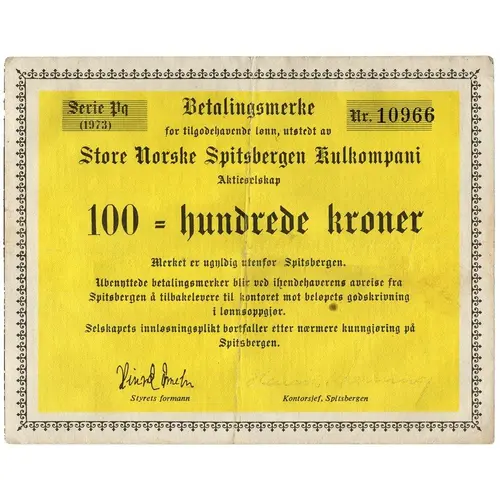 Betalingsmerke for tilgodehavende lønn, utstedt av Store Norske Spitsbergen Kulkompani Aktieselskap 100 = hundrede kroner Merket er ugyldig utenfor Spitsbergen. Ubenyttede betalingsmerker blir ved ihendehaverens avreise fra Spitsbergen å tilbakelevere til kontoret mot beløpets godskrivning i lønnsoppgjør. Selskapets innløsningsplikt bortfaller etter nærmere kunngjøring på Spitsbergen. Styrets formann. Kontorsjef, Spitsbergen. (Translation: Payment note issued by The Great Norwegian Spitsbergen Coal Company for due wages 100 kroner The note is invalid outside Spitsbergen. Unused payment notes must be returned upon the holder`s departure from Spitsbergen to the office againt the amount being credited on the payroll. The company`s obligation ceases after further announcement on Spitsbergen. Chairman of the board. Office manager, Spitsbergen.) |