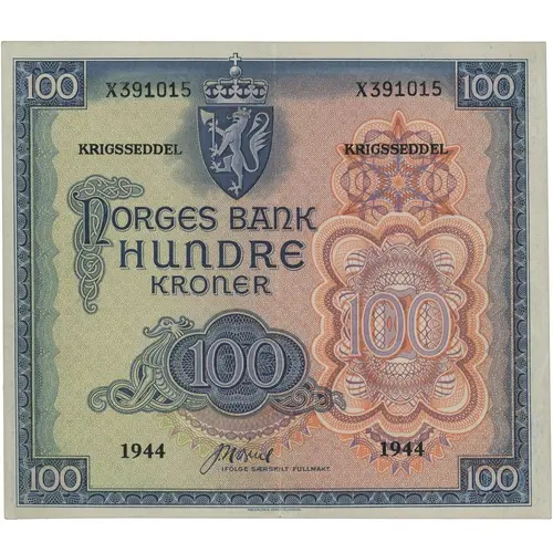 KRIGSSEDDEL KRIGSSEDDEL NORGES BANK HUNDRE KRONER 100 1944 1944 IFÖLGE SÆRSKILT FULLMAKT WATERLOW & SONS LIMITED, LONDON |