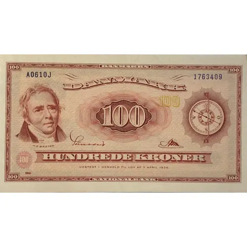 | Obverse lettering | Serialnumber DANMARK number 100 H.C. Ørsted 2 signatures HUNDREDE KRONER UDSTEDT I HENHOLD TIL LOV AF 7. APRIL 1936 1961 NATIONALBANK (Translation: Denmark A hundred Kroner Issued in accordance with low of April 7th, 1936. National bank) |