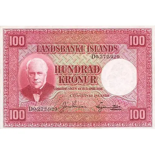 100 LANDSBANKI ÍSLANDS 100 HUNDRAÐ KRÓNUR SAMKVÆMT LÖGUM NR 10 15. APRIL 1928 LANDSBANKI ÍSLANDS 100 100 (Translation: National Bank of Iceland Hundred Krónur According to Law No. 10 15. April 1928 National Bank of Iceland) |