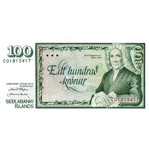 | Descrizione del dritto | Green print. Picture of Árni Magnússon at right. Middle has value and a little to the top left is tactile dots for the blinds. At the bottom left the law of issue, signatures and bank name. |