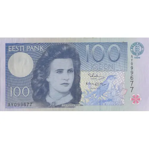 | 表面の説明 | The front side of the 100-kroon banknote features LYDIA KOIDULA (1843–1886) – an Estonian poetess, playwright and one of the prominent figures of the national awakening movement in the 19th century. |