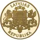 The large coat of arms of the Republic of Latvia is placed in the centre. The inscriptions LATVIJAS and REPUBLIKA, each arranged in a semicircle, are above and beneath the central motif, respectively. |