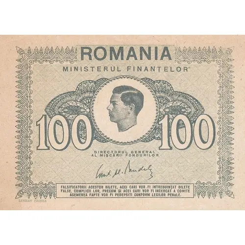 | Obverse lettering | ROMANIA MINISTERUL FINANTELOR 100 100 DIRECTORUL GENERAL AL MISCARII FONDURILOE FALSIFICATORII ACESTOR BILETE, ACEI CEI VOR FI INTREBUINTAT BILETELE FALSE, COMPLICII LOR, PRECUM SI ACEI CARI VOR FI INCERCAT A COMITE ASEMENEA FAPTE VOR FI PEDEPSITI CONFORM LEGILOR PENALE SERBAN ZAINEA |