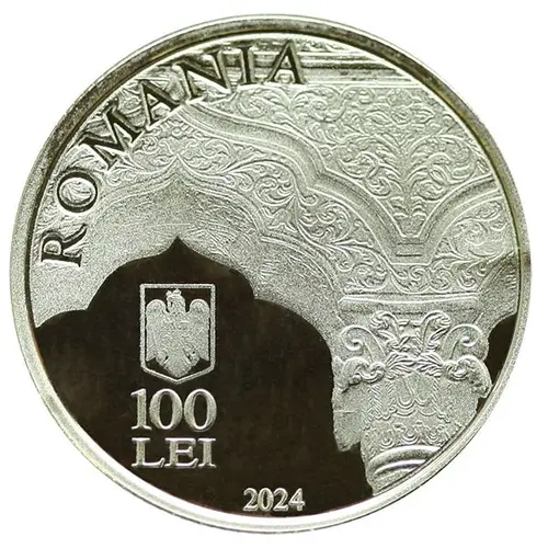 | Obverse description | A Brâncovenesc-style motif in the porch of Stavropoleos Church, the inscription “ROMANIA” in an arc, the coat of arms of Romania, the face value “100 LEI”, and the year of issue “2024” |