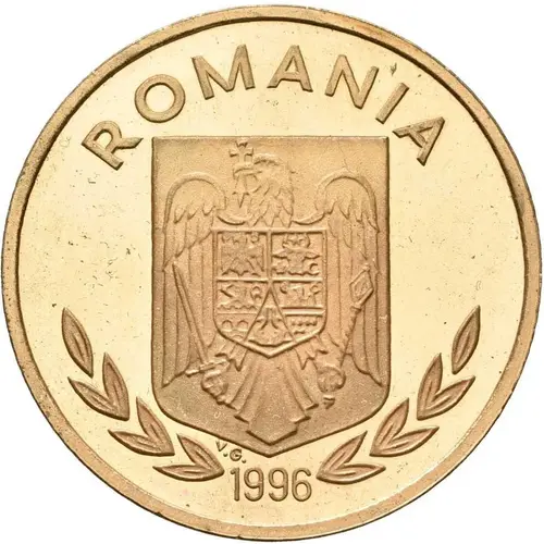 Romania`s Coat of Arms placed in the middle, between a laurel twig on the left and an oak twig on the right; above, the circular inscription `ROMANIA`; below, the year of issue `1996` without face value |