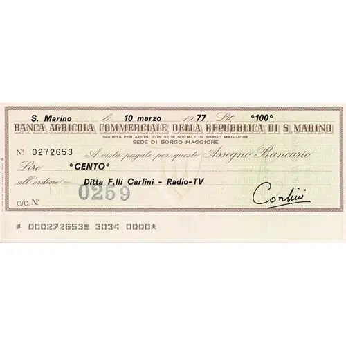 | Obverse lettering | S. Marino li 10 Marzo 1977 Lit. 100 BANCA AGRICOLA COMMERCIALE DELLA REPUBBLICA DI S. MARINO SOCIETA` PER AZIONI CON SEDE LEGALE IN BORGO MAGGIORE SEDE DI BORGO MAGGIORE A vista pagate per questo Assegno Bancario Lire CENTO all`ordine Ditta F.lli Carlini - Radio-TV |