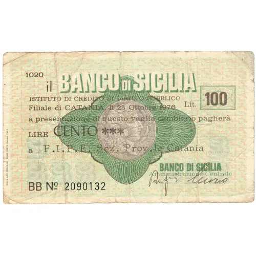| Obverse lettering | il BANCO DI SICILIA ISTITUTO DI CREDITO DI DIRITTO PUBBLICO Filiale di CATANIA, li 25 Ottobre 1976 a presentazione di questo vaglia cambiario pagherà LIRE CENTO *** a Societa Cattolica di Assicurazione-Verona BANCO DI SICILIA AMMINISTRAZIONE CENTRALE (Translation: The Bank of Sicily Public Law Credit Institute Catania Branch upon presentation of this promissory note, will pay One Hundred Lire to |