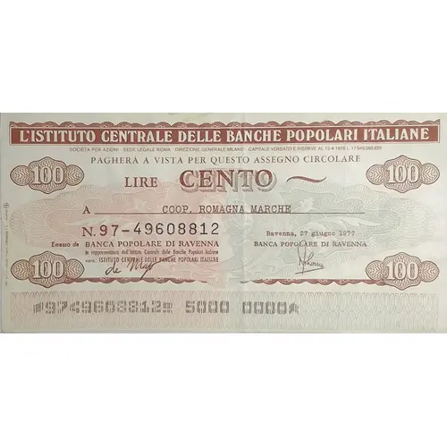 | Obverse lettering | L`ISTITUTO CENTRALE DELLE BANCHE POPOLARI ITALIANE SOCIETÀ PER AZIONI - SEDE LEGALE ROMA - DIREZIONE GENERALE MILANO - CAPITALE VERSATO E RISERVE AL 12-4-1976 L. 17.545.065.825 PAGHERÀ A VISTA PER QUESTO ASSEGNO CIRCOLARE LIRE CENTO A COOP. ROMAGNA MARCHE Emesso da BANCA POPOLARE DI RAVENNA in rappresentanza dell` Istituto Centrale delle banche Popolari Italiane visto: ISTITUTO CENTRALE DELLE BANCHE POPOLARI ITALIANE (Translation: The Central Institute of Italian People`s Banks Limited Company - Headquarters in Rome - Directorate General in Milan Paid Capital and Reserves as of 12-04-1976 (April 04): 17,545,065,825 Lire will pay 100 Lire for this certified check on sight. Catholic Insurance Company - Verona Issued by People`s Mutual Bank of Verona representing The Central Institute of Italian People`s Banks |