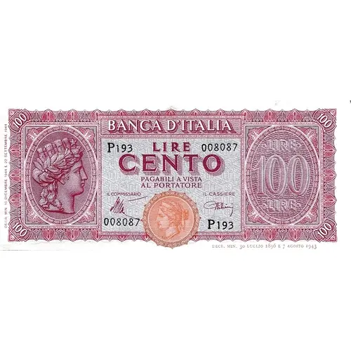 | Legenda del dritto | BANCA D`ITALIA LIRE CENTO PAGABILI A VISTA AL PORTATORE (Translation: BANK OF ITALY ONE HUNDRED LIRE PAYABLE AT SIGHT TO BEARER) |